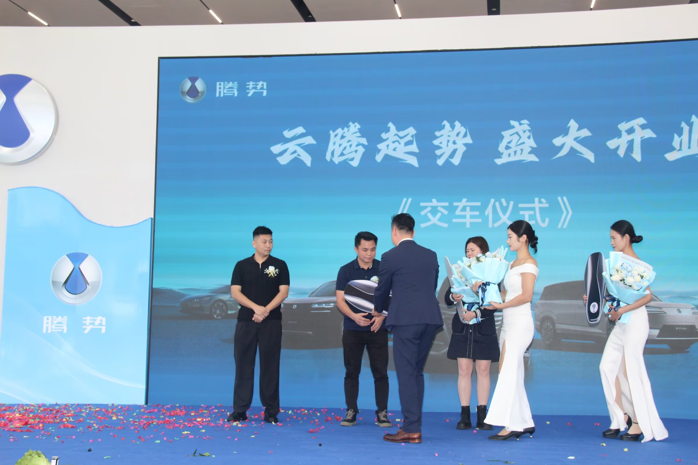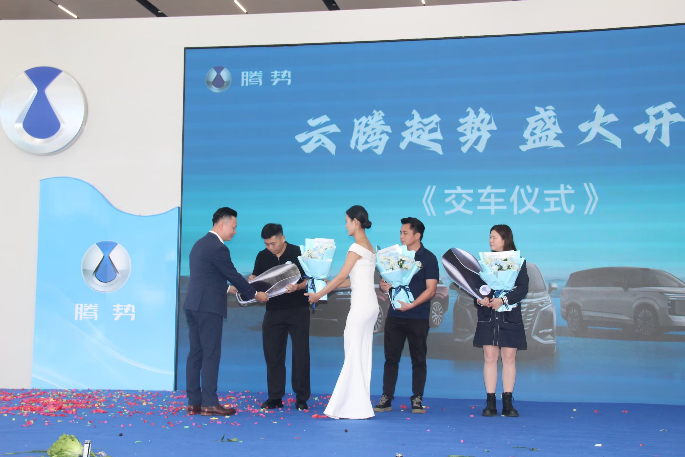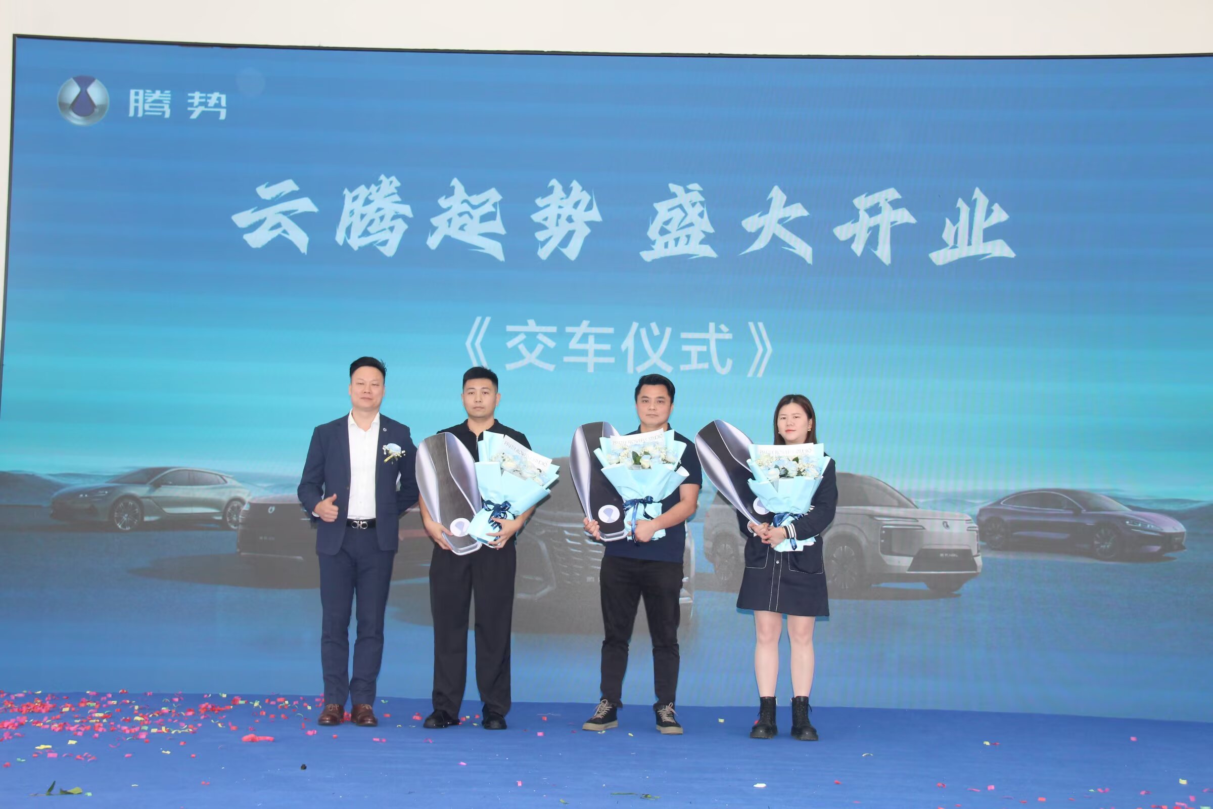 隆重的授权授牌仪式,明确了茂名云腾作为腾势授权品牌4S店的官方身份与服务职责。紧接着,现场迎来了一个温馨而意义非凡的环节——首批车主交车仪式。三位早早选定腾势爱车的幸运车主受邀登台,从领导手中接过了象征信任与承诺的车钥匙,并接受了工作人员献上的鲜花。这一仪式不仅标志着茂名云腾正式将首批新车交付给用户,更以实际行动兑现了对本地消费者的服务承诺,赢得了全场热烈的祝福掌声。 此后,充满岭南民俗特色的“接青”环节温馨上演,寓意接纳四方福气与吉祥祝福,体现了企业对未来发展的坚定信心与美好期待。